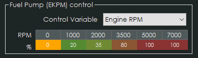 CANTCU is able to control the fuel pump control module (EKPM) on the E6789x cars as a part of the stock ECU emulation. A simple 1x6 map with 0-100% output can be user-defined. The pump control value will interpolate between the cell values.