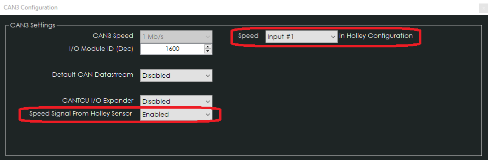 For voltage-based inputs, the configuration allows to scale the input value to a suitable value to be used in Holley. For example, Input #39 “CANTCU Delta RPM” is a 0-10000RPM value that's scaled to a 0-20V value through CAN, and needs to be rescaled back to 0-10000RPM in Holley. Note the CAN ID and Input # reflecting the specs listed in the Holley Receive Values table above.