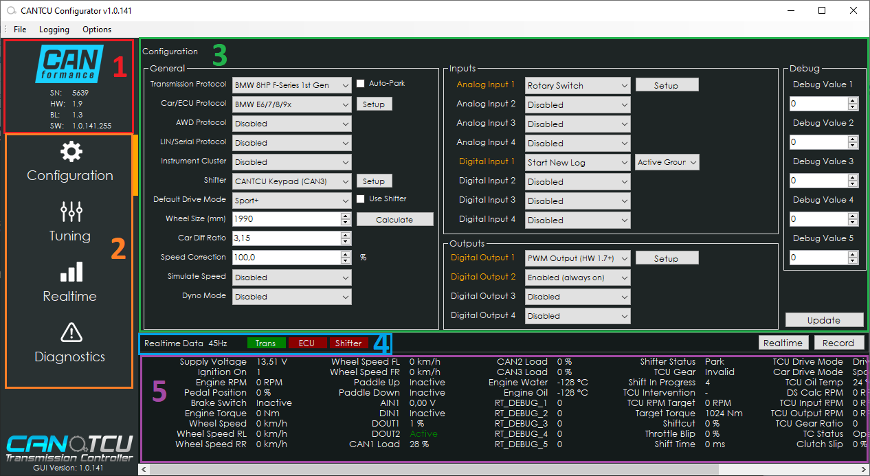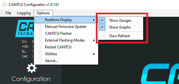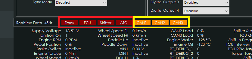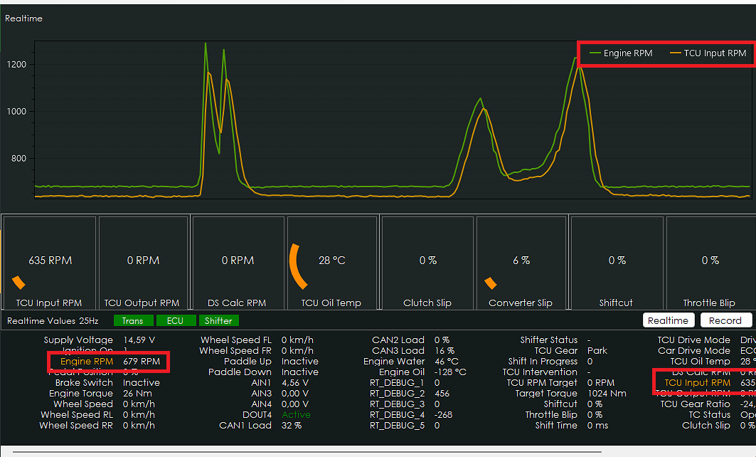 In the realtime-section of the software, you can show realtime graphs and/or gauges to visualize running values from the transmission, ECU and CANTCU.
