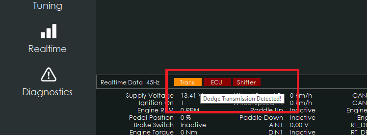 If an unsupported transmission is connected, it might be detected in CANTCU by an orange-colored transmission indicator. Hovering mouse over the indicator will show which transmission is detected. Note that not all unsupported transmissions are automatically detected.